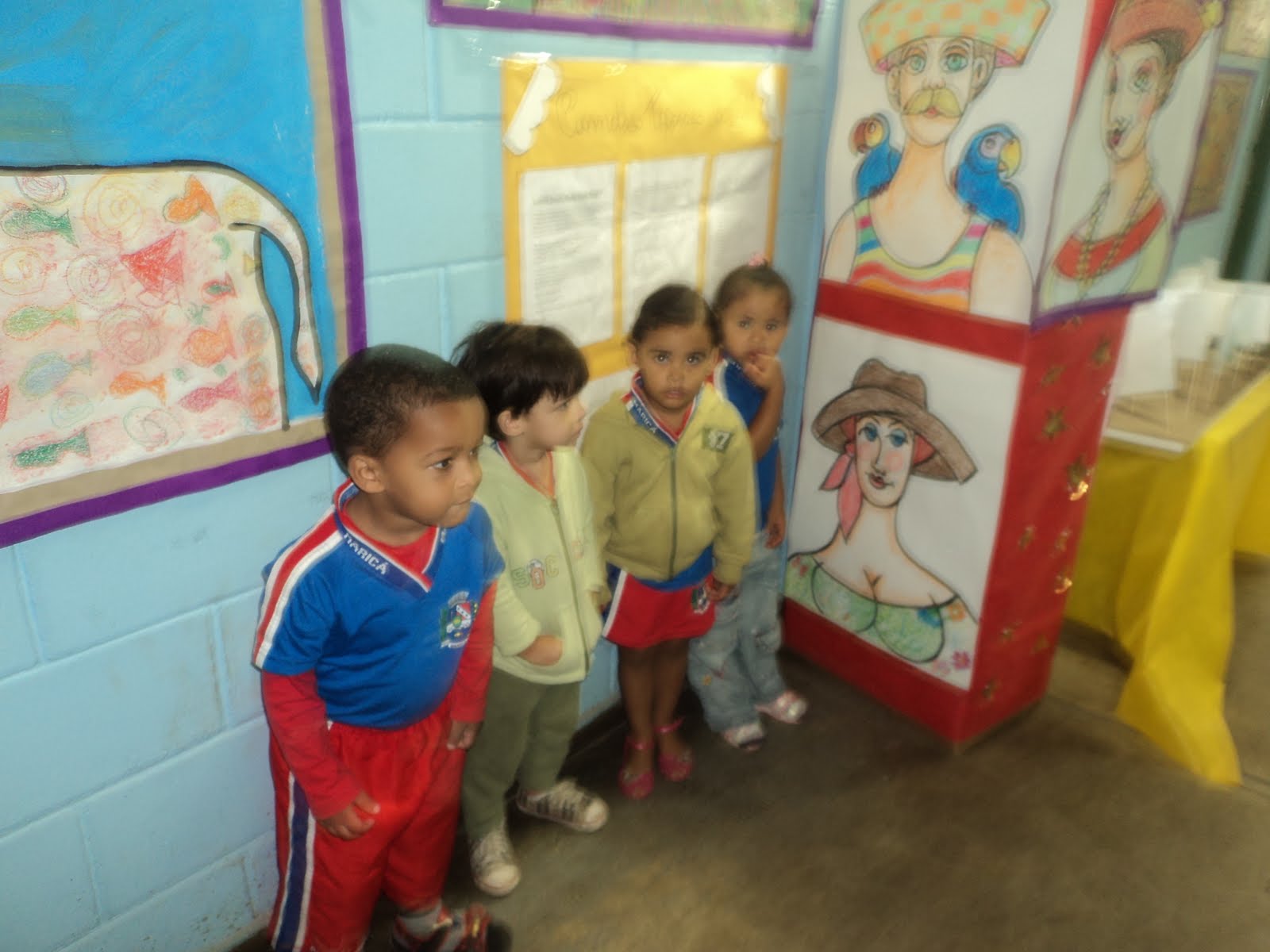 | Cartaz coletivo- pintura e colagem realizada por crianças de creche utilizando guache e cola colorida com as pontas dos dedos e com o pincel. |